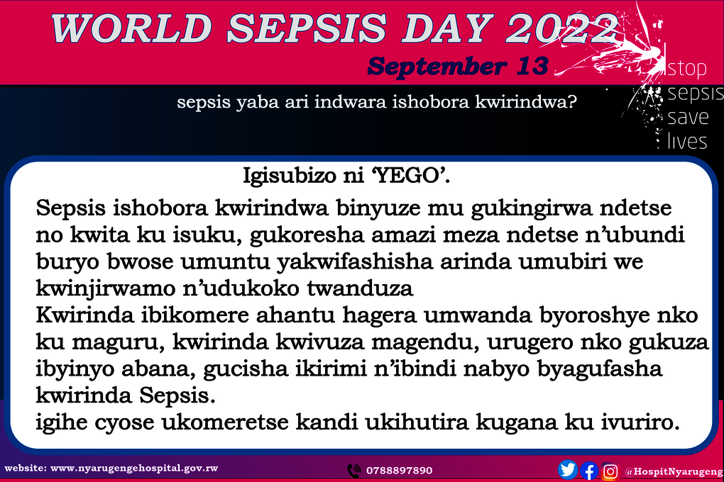 Ku Bitaro by’Akarere ka Nyarugenge, ushobora kuhabona Serivisi z’ubuvuzi bwa Sepsis ndetse n’izindi ndwara ziterwa n’udukoko twanduza. Niba ugaragaza bimwe mu bimenyetso by’iyi ndwara, ushobora kutugana muganga wacu w’inzobere mu buvuzi bw’indwara zo mu mubiri akagufasha. Ibuka kwitwaza ubwishingizi bw’ubuvuzi ndetse n’urwandiko rwa muganga (medical transfer) aho biri ngombwa, ubundi uhabwe ubuvuzi utararemba.